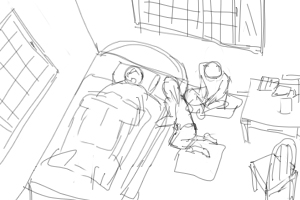 暗い部屋からそれを見る3人 ■左へパン ■100