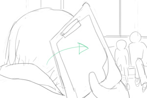 他の患者さんたちの目線A この時点で手前に次登場する看護師の 体がボケて移っていてカメラ側に 歩いていっててもいい ■30 ■若干右へ |