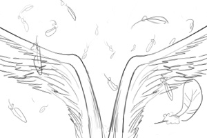 ヨーコの顔アップ (翼をみている) 手前に白い羽が一枚スローでひらひら落ちていく ■90 |