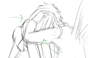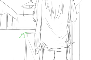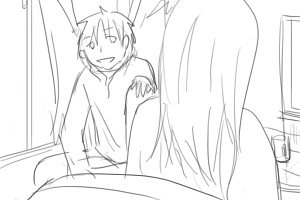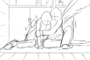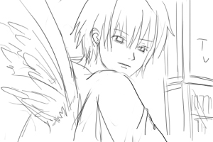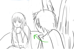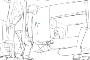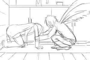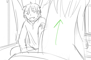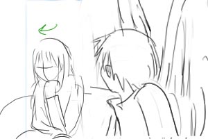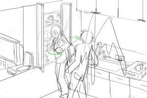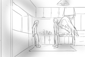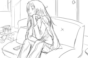 カズオは雑誌に目を落としている(手前) 後ろでヨーコ(ソファにいる)がカズオの翼をみつめている ■上へ 手前に翼、ヨーコのバスとアップをフォーカス ヨーコはじっと翼を見つめている 視線に気づいてカズオが振り向いて起き上がる(画面手前で後ろ姿)